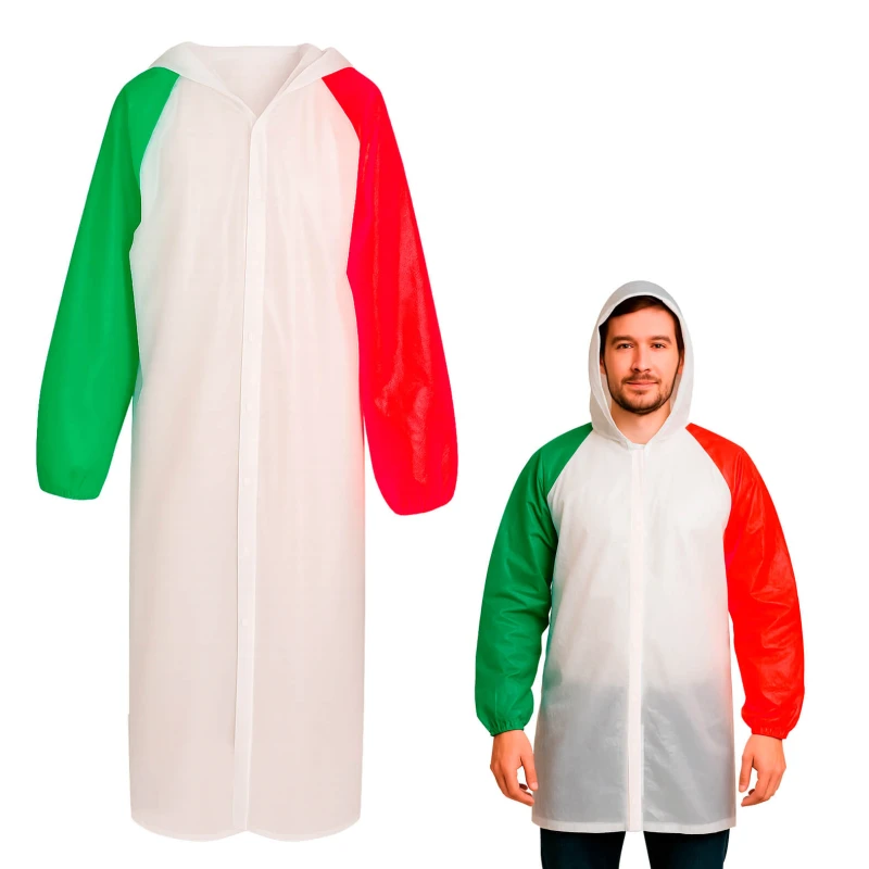 Impermeable tricolor con capucha botones y mangas con resorte. 69 x 120 cm.