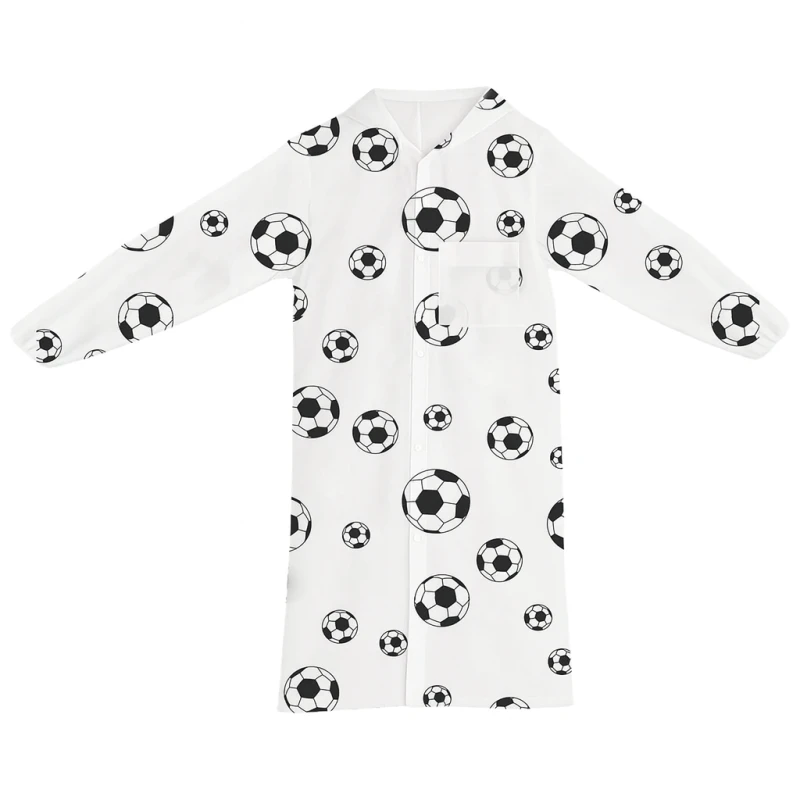Impermeable con print de balones de soccer, con capucha y botones. 70 x 120 cm.